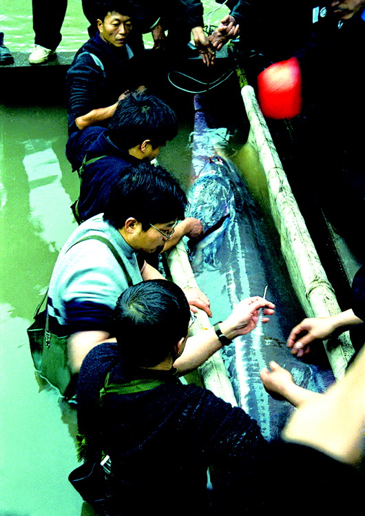 ▲2003年1月27日,在四川宜賓主城區(qū)附近的長江岸邊,專家正在對一只白鱘進(jìn)行救治,這只白鱘是一位漁民在涪溪口發(fā)現(xiàn)的。 張光金攝