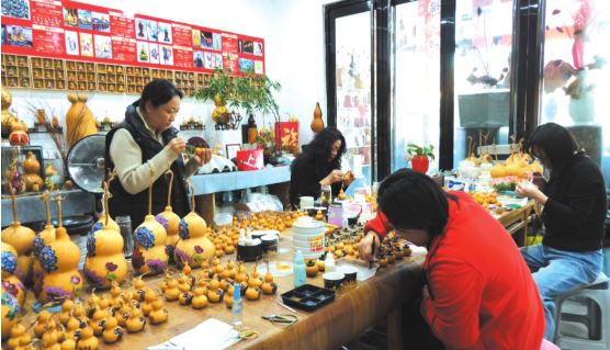 在工作室內(nèi),手工藝人侯晉麗正專注地為葫蘆彩繪。她介紹說(shuō):“我們制作的每一件葫蘆雕刻作品都需要多重工序,從篩選葫蘆到刮皮、晾曬、浸泡、拋光,再到依形構(gòu)思、打稿設(shè)計(jì),最后經(jīng)過(guò)線刻、浮雕等精雕細(xì)琢與上色收尾,每一個(gè)工序都考驗(yàn)著我們的耐心與功力?!?/p>