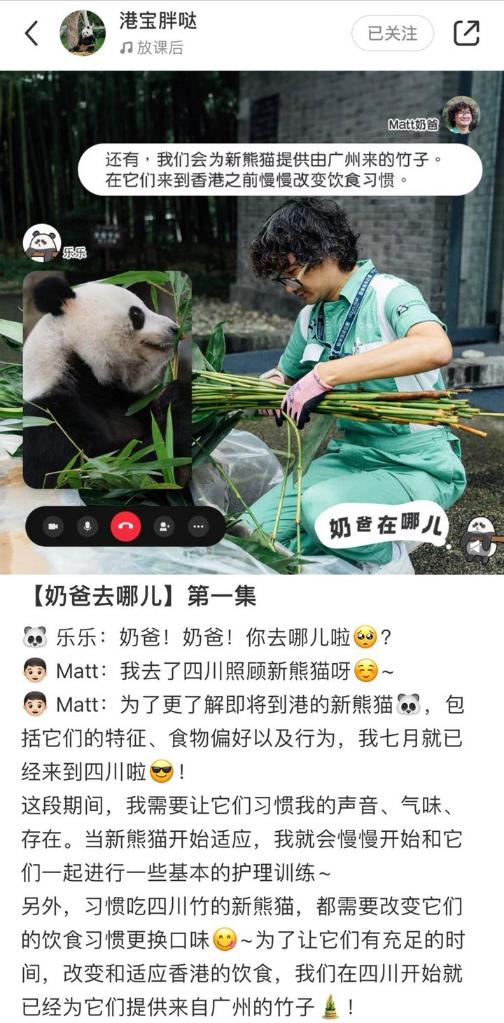 為了解新赴港大熊貓的特征、食物偏好以及行為,香港海洋公園的大熊貓護(hù)理員梁家綸7月已抵達(dá)四川,讓大熊貓們習(xí)慣他的聲音、氣味、存在,大熊貓適應(yīng)后,他開始和它們一起進(jìn)行基本護(hù)理訓(xùn)練。