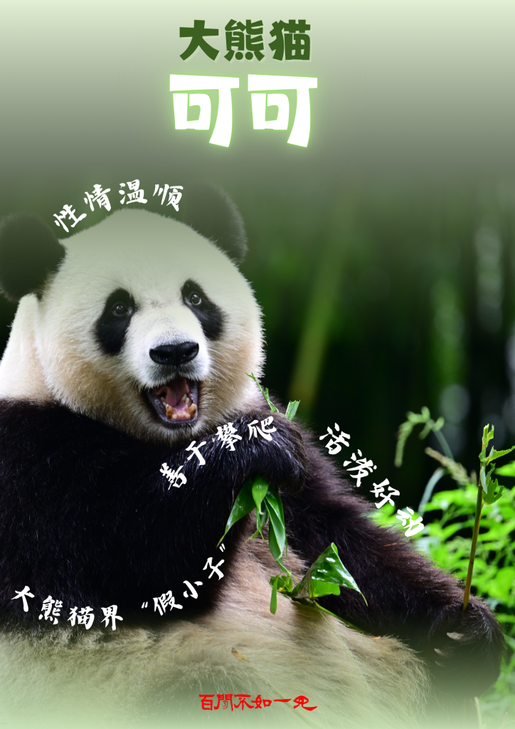 大熊貓“可可”,原名“甜可”,雌性,2019年6月出生,性情溫順、活波好動,善于攀爬,典型的大熊貓界“假小子”。