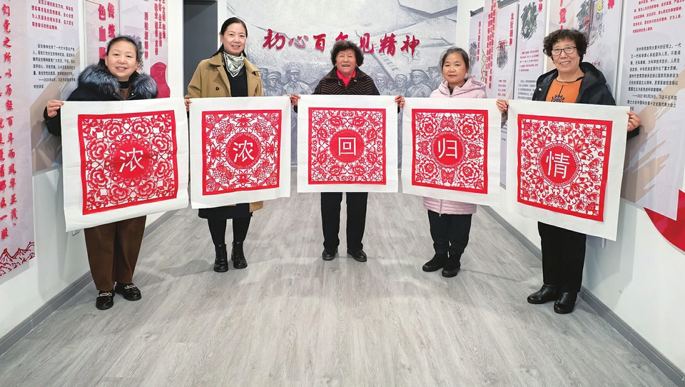 12月17日,陽泉市城區(qū)下站街道,陽泉市級非遺傳承人董淑芳(左二)與剪紙愛好者展示主題剪紙作品。當日,下站街道舉辦“濃濃回歸情”主題剪紙活動,慶祝澳門回歸祖國25周年。所展示的剪紙作品圖案有的是澳門特別行政區(qū)區(qū)花蓮花,有的是象征團結繁榮的牡丹花,還有象征福氣與好運的福蝶和象征吉祥富貴的金魚。一幅幅精美的剪紙作品,表達了大家濃濃的愛國之情。