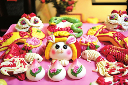 大肚福袋寓意福氣滿滿;醒獅賀歲,活靈活現(xiàn),送上吉祥如意;帶著梅花、中國結(jié)的寶葫蘆寓意福祿雙全……精選面粉純手工捏出的非遺花饃,有“饃”有樣,麥香十足,“蒸”出了咱老百姓新年的紅紅火火。