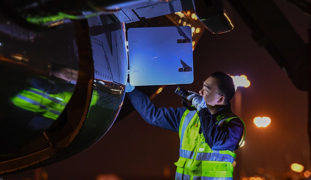 1月11日,在??诿捞m國際機場停機坪上,南航工程技術(shù)分公司機務工程師對飛機進行深度檢查。新華社記者 楊冠宇 攝