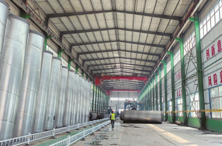 韓建河山朔州分公司生產(chǎn)車間,等待試壓檢驗(yàn)的鋼筒。