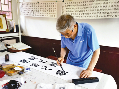 交城卦山書院有“山西姥爺”王朝珠的工作室,在墨香與花香中,山西晚報記者講起“山河+”客戶端的發(fā)展,說起2004年其兄長王朝瑞先生贈送墨寶的來歷,王朝珠老先生感嘆這份情意和緣分,便揮毫潑墨,接連寫下書法作品饋贈山西晚報。特別是在“山河+鄰聚里”隸書中,加蓋了剛剛制印好的“山西姥爺”篆書印章,告訴記者“這枚印章還是第一次啟用咧?!?/p>