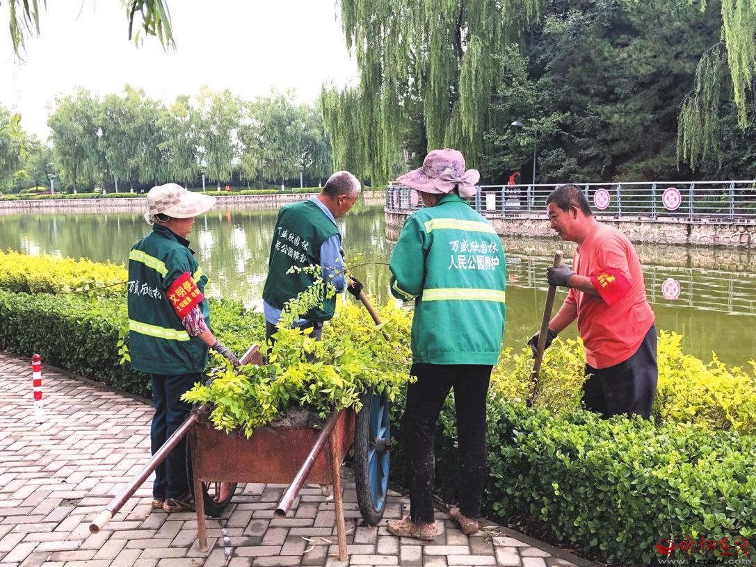 為美化綠化人居環(huán)境,營造“文明健康 有你有我”的社會氛圍,近日,佩戴“文明使者”袖章的園林工人在人民公園進行苗木補植,對花卉進行更換,助力我市創(chuàng)建全國文明城市。 張 曄 攝