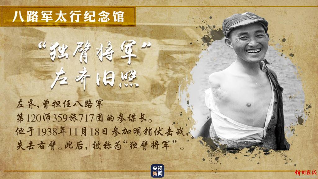 一張獨(dú)臂將軍的舊照,展現(xiàn)出八路軍為爭(zhēng)取民族獨(dú)立,不怕?tīng)奚⒉晃菲D險(xiǎn)的革命英雄主義精神。