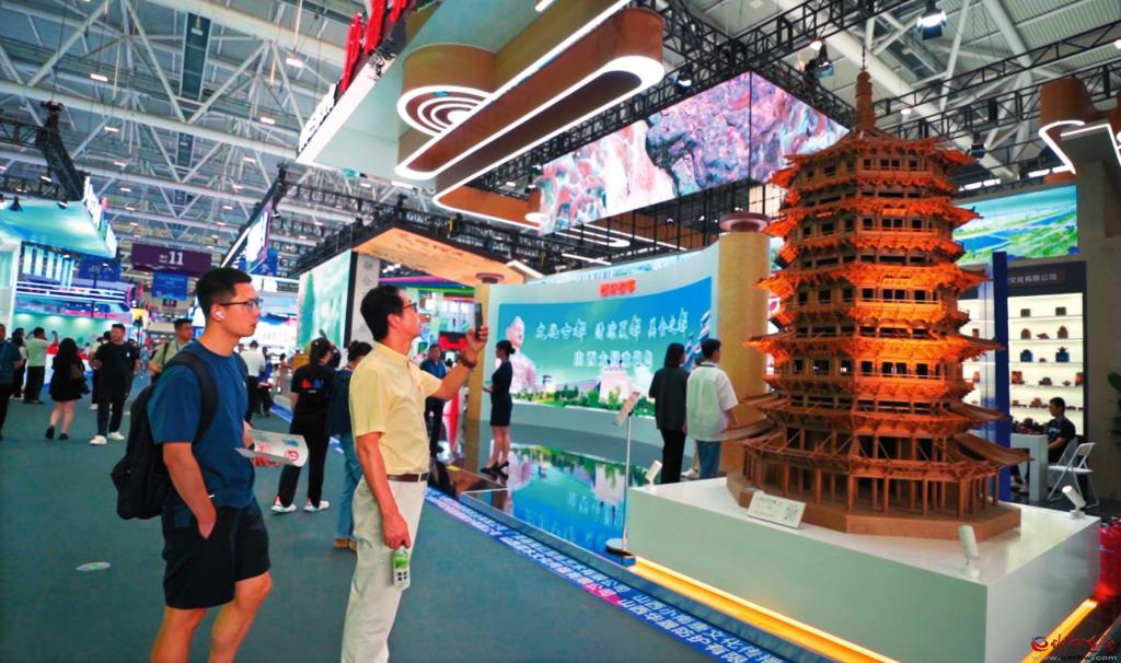 山西晟龍木雕模型藝術(shù)有限公司制作的應(yīng)縣木塔模型一亮相,便吸引了眾多觀展游客的目光。精美絕倫的造型引得人們嘖嘖稱奇,紛紛拿出手機(jī)拍照記錄分享。該模型高約3米,最大直徑1.9米,通過20∶1的比例微縮打造,復(fù)刻了應(yīng)縣木塔的榫卯結(jié)構(gòu),其內(nèi)部樓梯扶手清晰可見,門窗都能打開。“我們的這件展品,是由二十多個(gè)師傅經(jīng)過半年多的時(shí)間完成的。這次為了來深圳參展,我們專門把它從定襄裝運(yùn)發(fā)車,用了整整兩天半的時(shí)間才送到,跨越了將近兩千公里。”該公司總經(jīng)理張艷峰告訴記者。