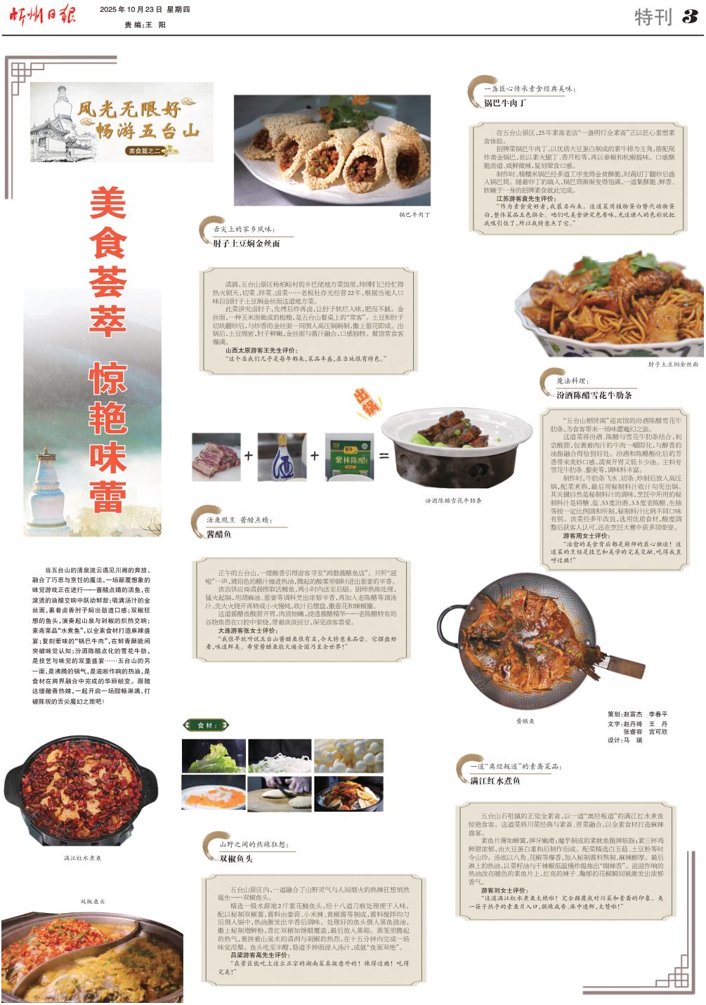 當(dāng)五臺(tái)山的清泉流云遇見(jiàn)川湘的奔放、融合了巧思與烹飪的魔法,一場(chǎng)顛覆想象的味覺(jué)游戲正在進(jìn)行——醬醋點(diǎn)睛的活魚(yú),在滾燙的油醋交響中躍動(dòng)鮮甜;吸滿(mǎn)湯汁的金絲面,裹著鹵香肘子燜出勁道口感;雙椒狂想的魚(yú)頭,演奏起山泉與剁椒的熾熱交響;素齋菜品“水煮魚(yú)”,以全素食材打造麻辣盛宴;復(fù)刻葷味的“鍋巴牛肉”,在鮮香酥脆間突破味覺(jué)認(rèn)知;汾酒陳醋點(diǎn)化的雪花牛肋,是技藝與味覺(jué)的雙重盛宴……五臺(tái)山的另一面,是沸騰的鍋氣,是滋啦作響的熱油,是食材在跨界融合中完成的華麗蛻變。跟隨這縷酸香熱辣,一起開(kāi)啟一場(chǎng)酣暢淋漓、打破陳規(guī)的舌尖魔幻之旅吧!
