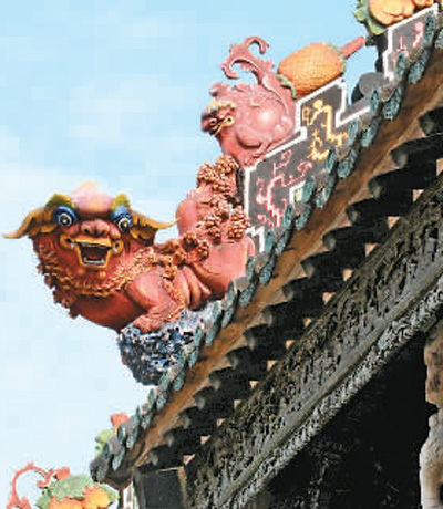 “三雕兩塑”(石雕、木雕、磚雕、陶塑、灰塑)是嶺南傳統(tǒng)建筑常用構(gòu)件。陳家祠建筑屋頂上裝飾著層疊錯落、精致繁復(fù)的陶塑和灰塑,堪稱一大亮點。曾翔介紹,最頂層的陶塑瓦脊就是著名的“石灣陶”,在廣東佛山石灣鎮(zhèn)燒制而成,內(nèi)容一般以粵劇故事、花卉和吉祥圖案為主。瓦脊下方的基座是灰塑。灰塑的制作工藝比較特別,用石灰摻入糖膠、稻草、糯米等混合發(fā)酵后,往房頂?shù)你~鐵骨架上填抹塑形,再涂上顏色?;宜軟]有經(jīng)過高溫燒制,容易受風(fēng)雨侵蝕而剝落掉色,每隔五六年就要進行保養(yǎng)修復(fù)。