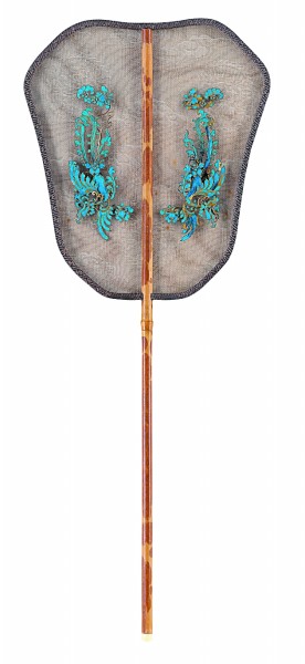 湘妃竹柄,夾祥云團鶴紋羅及草編面,鑲玉、點翠鳳凰八邊形扇 蔡念群
