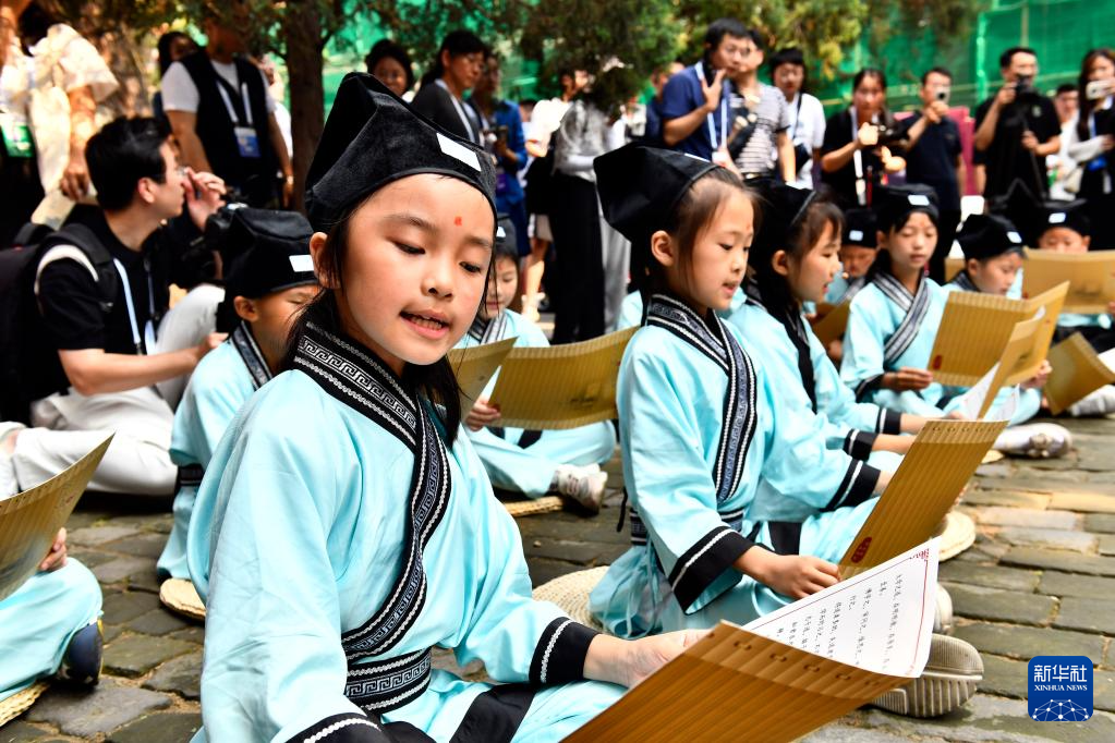 6月27日,在曲阜孔廟,嘉賓和游客在聆聽孩子們誦讀《論語(yǔ)》。