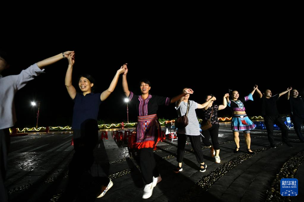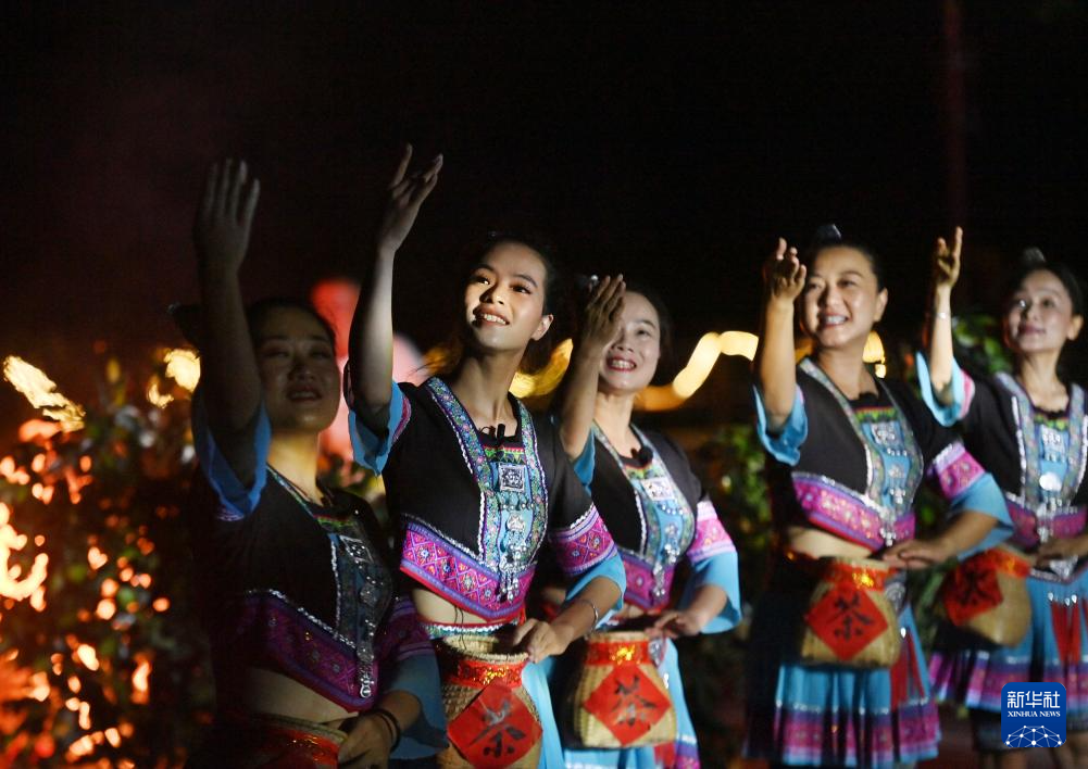 9月5日,在梧州市蒼梧縣六堡鎮(zhèn)山坪村同心廣場,村民在篝火晚會上跳采茶舞。