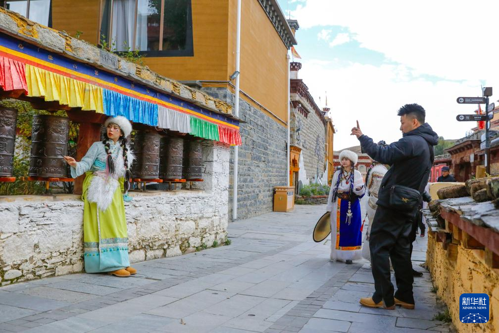 10月10日,游客在理塘縣勒通古鎮(zhèn)拍藏族風(fēng)情寫真。