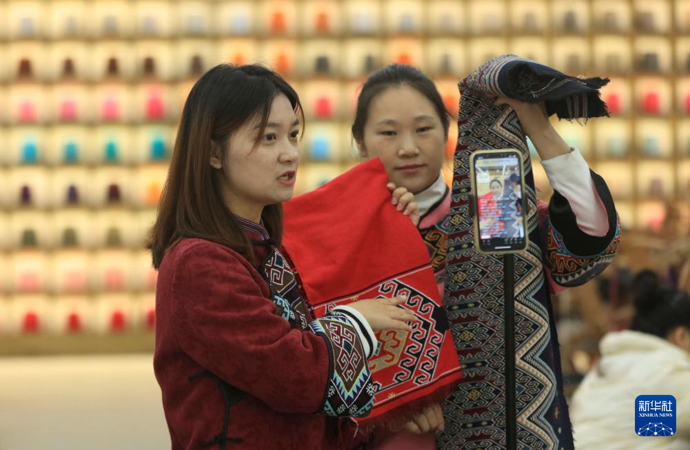 11月12日,在張家界市武陵源區(qū)乖幺妹土家族織錦基地,工人在直播銷售土家族織錦產品。