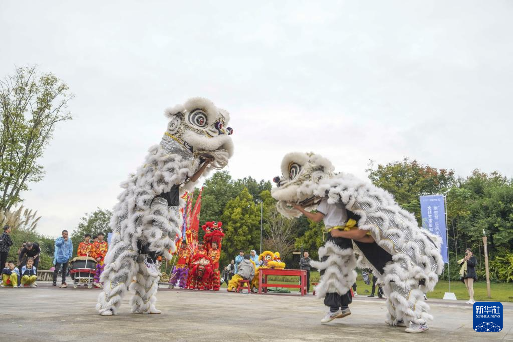 11月11日,在浙江省溫州市三垟濕地公園北廣場(chǎng),舞獅隊(duì)選手在比賽中。