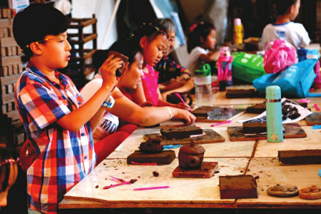 小學生在晉派磚雕傳習所學習傳拓技藝。