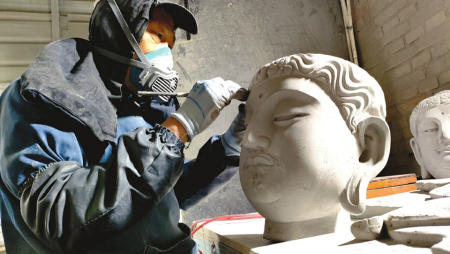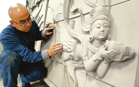 11月22日,晉中市太谷區(qū)晉派磚雕研究所,省級非遺項目晉派磚雕代表性傳承人溫建明正在為《飛天》磚雕作品進行最后的創(chuàng)作。
