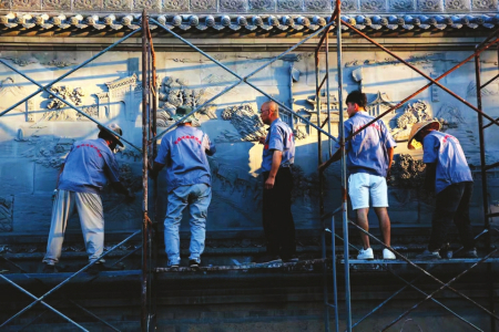 溫建明帶領團隊為榆次什貼古鎮(zhèn)創(chuàng)作160米的《晉商萬里茶道》大型磚雕文化墻。
