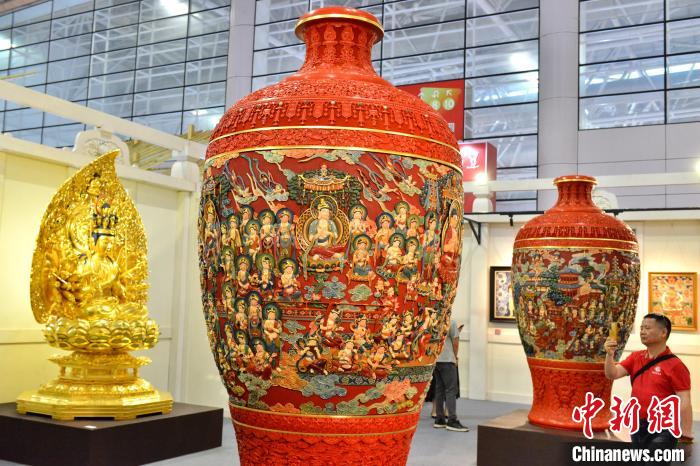 5月9日,第四屆中國工藝美術博覽會在福建福州啟幕,圖為雕漆作品《凈土文化對瓶》吸引觀展者目光。 中新網(wǎng)記者 呂明 攝