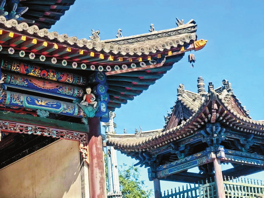 武廟內(nèi)的主要建筑是按照帝王殿宇的規(guī)制和風格建造,以關帝殿為例,屋頂采用的是單檐廡殿頂,構(gòu)架為七檁前后廊式,前后檐柱頭科為五踩單翹單昂,前檐明次間施四扇六抹格扇門。廟內(nèi)楹聯(lián)所題文字均鑲銅材,各殿塑像也多為銅制,這與代縣歷史上盛產(chǎn)銅且擅長制作銅器有很大關系。
