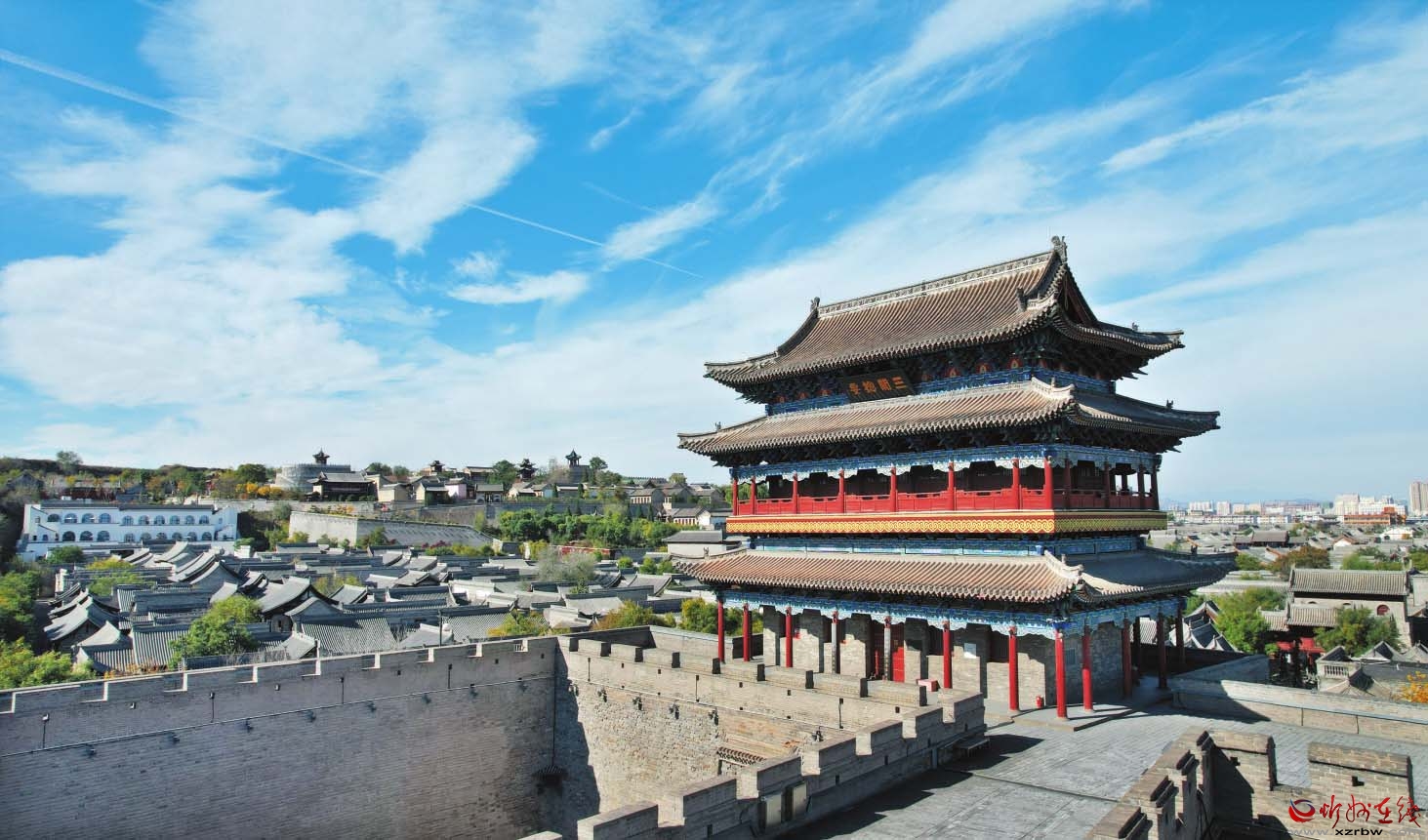 四門皆重建于明萬(wàn)歷二十四年(1596年)。南門“景賢門”,城樓面闊七間,進(jìn)深四間,重檐歇山頂,四角飛檐,樓梯三層,構(gòu)思精巧,樓內(nèi)無(wú)柱,三層檐下正中懸掛“三關(guān)總要”匾額。東門“永豐門”,城樓匾額“獻(xiàn)佳合北”。東門到南北大街是東大街。西門“新興門”,城樓匾額“九峰雄峙”。西門通南北大街,古城原有略顯彎曲的西大街。