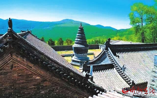 從忻臺(tái)旅游公路駛?cè)肱_(tái)豆線,燦爛輝煌的金閣古寺就位于南臺(tái)和中臺(tái)之間的金閣嶺上,海拔1900米,宛若天上宮闕。初秋時(shí)節(jié),遠(yuǎn)處山色空蒙,峰巒凝碧,近處樹蔭蔽日,曲徑通幽。累代的晨鐘暮鼓及戰(zhàn)亂的刀光劍影都散落在歲月深處,輕柔的風(fēng)拂過往事滄桑。