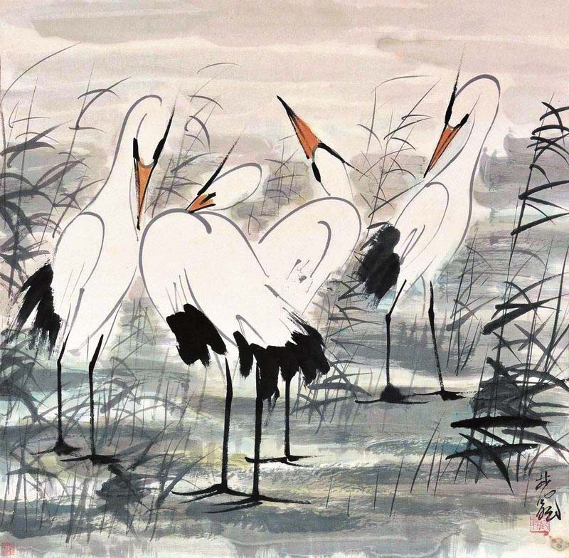 到了近現(xiàn)代,傳統(tǒng)文藝思想開始發(fā)生轉(zhuǎn)變,呂澂、康有為等人在繪畫領(lǐng)域提出改良思想,鶴主題的繪畫也有所變化。在林風(fēng)眠創(chuàng)作的《群鶴圖》《雙鶴圖》《白鶴》等作品中,既可以看到中國畫白描的影子,又可以感受到西方速寫技法的影響?!度胡Q圖》由幾只立于廣袤水草的白鶴構(gòu)成,它們姿態(tài)各不相同。與鶴之閑適姿態(tài)相對應(yīng)的是隨風(fēng)浮動(dòng)的蘆葦,它們在微風(fēng)吹拂下雖形態(tài)萬千,但并不雜亂,在總體偏暗的色調(diào)中顯出和諧之味?!峨p鶴圖》表現(xiàn)了鶴的輕盈姿態(tài),兩只鶴步伐保持一致,展示出閑適自得之感。林風(fēng)眠筆下的鶴,顯然沒有古代繪畫中仙風(fēng)道骨、富貴長壽之意,與寫意之鶴相比,其作品里的鶴與自然萬物融為一體,表達(dá)出強(qiáng)有力的現(xiàn)代語言。