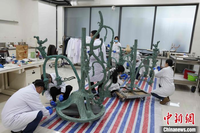 青銅神樹復(fù)制品制作現(xiàn)場。三星堆博物館供圖