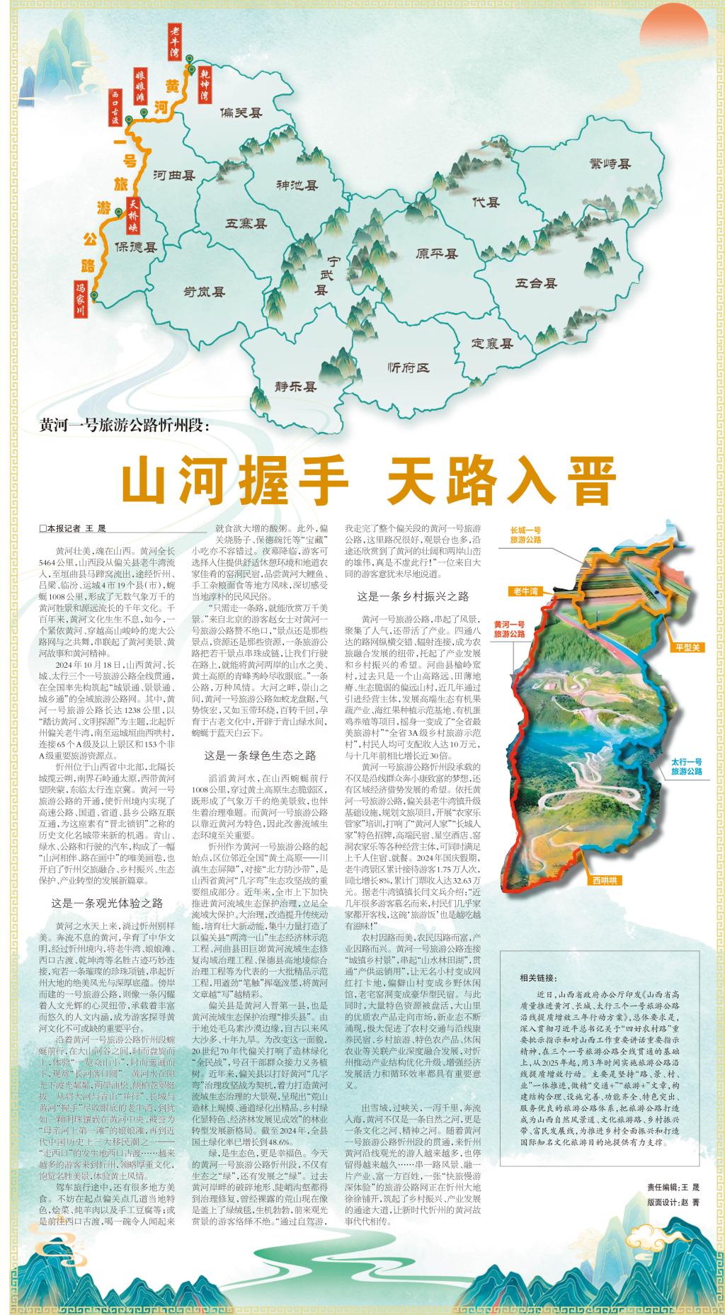 2024年10月18日,山西黃河、長城、太行三個一號旅游公路全線貫通,在全國率先構筑起“城景通、景景通、城鄉(xiāng)通”的全域旅游公路網(wǎng)。其中,黃河一號旅游公路長達1238公里,以“踏訪黃河、文明探源”為主題,北起忻州偏關老牛灣,南至運城垣曲西哄村,連接65個A級及以上景區(qū)和153個非A級重要旅游資源點。