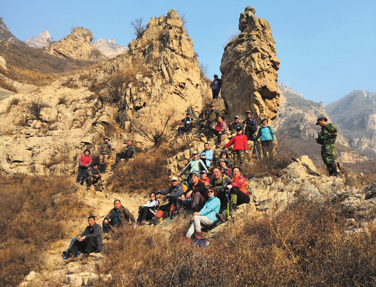 走過一片荊棘林,忽遇一塊巨石,之后眼前豁然開朗。放眼望去,群山環(huán)繞,松濤陣陣,紅葉、黃葉、綠葉相間,層林盡染,秋意濃濃。美景讓大家暫時忘記了疲勞!