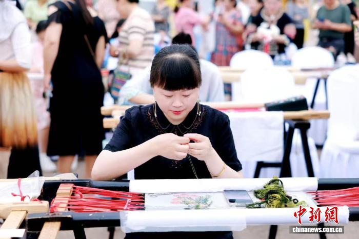 5月29日,第三屆“金針杯”中國刺繡技藝交流活動在四川成都郫都區(qū)舉行,現(xiàn)場蜀繡從業(yè)者展示刺繡技藝。(郫都區(qū)融媒體中心供圖)