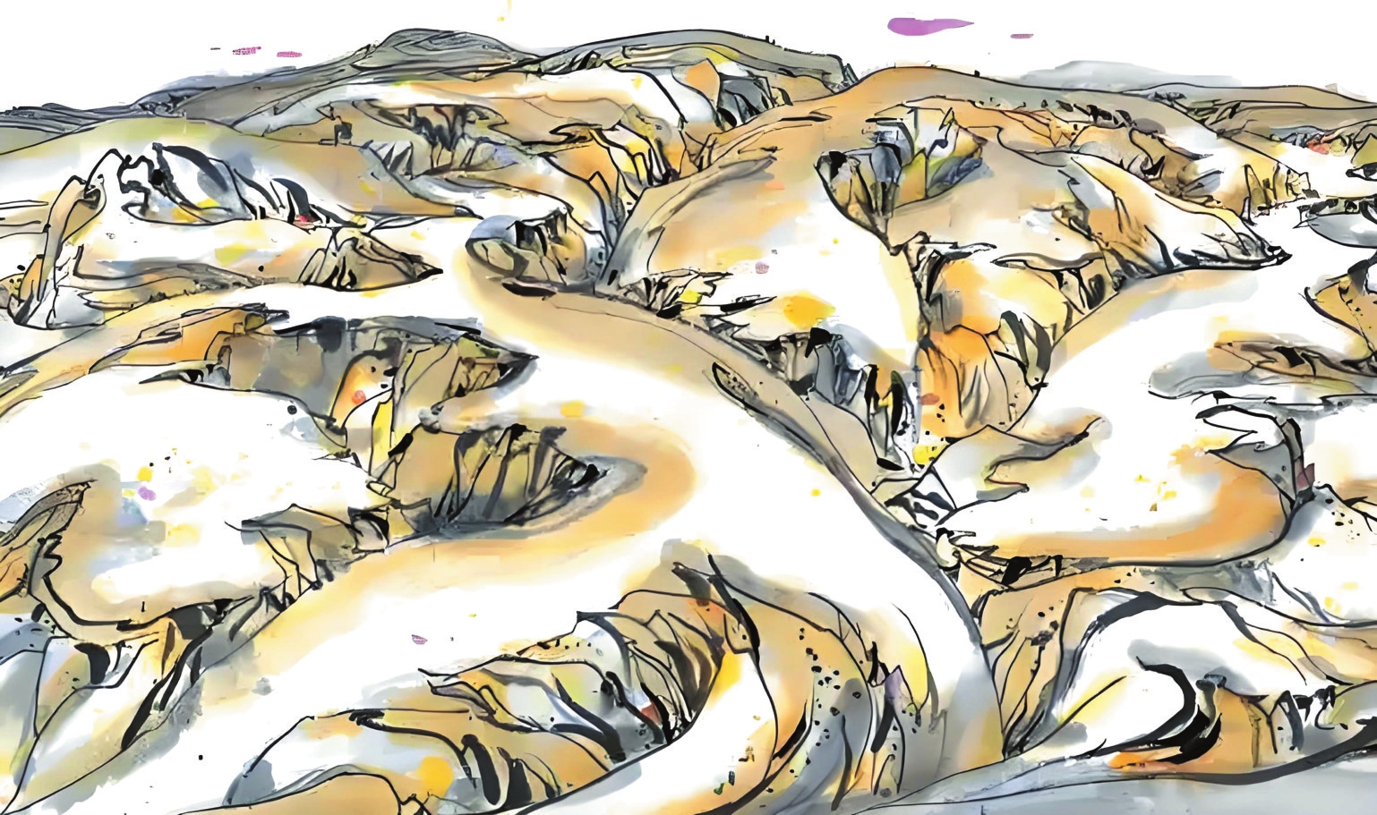 1989年10月的河曲寫生,是吳冠中藝術生涯的重要轉折點。在陪同的學生王秦生引導下,這位古稀老人尋找“黃土荒漠之典型地區(qū)”,最終駐足晉西北河曲縣。每日晨起,他面對被雨水沖刷、滿山皆溝壑的地貌,靜心思考,猛然產生了驚人的藝術聯想——起伏的山形如同眾多老虎,而那些溝壑恰似老虎皮毛上的斑紋。他在《出現老虎》一文中寫道:“我終于發(fā)現黃土高原是展拓了的老虎之群,其間伏臥著無數猛虎,有的正將躍起,有的還在酣睡。作完數幅黃土高原,意猶未盡,于是我畫起老虎來?!边@種將地理特征轉化為藝術創(chuàng)作標志著吳冠中完成“從風景寫生到精神寫意”的蛻變,其價值在于為現代中國畫開辟了根植本土、融貫中西的新路徑。一個月河曲翠峰山寫生之旅誕生的《老虎高原》,更以極富樂感的線條勾勒出這片土地精神的圖騰。