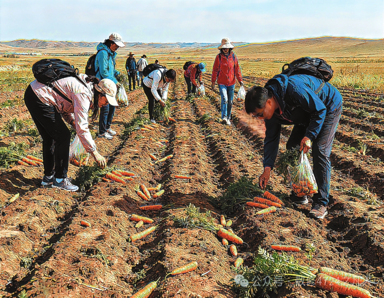 “撿秋”游演繹著“鄉(xiāng)土中國”的現(xiàn)代篇章。費孝通在《鄉(xiāng)土中國》開篇即言“從基層上看去,中國社會是鄉(xiāng)土性的”。這種“鄉(xiāng)土性”的核心是人與土地的深度綁定。農(nóng)民靠土地生存,土地是文化認(rèn)同的根基?!皳烨铩边@種農(nóng)耕活動,如今以更加鮮活方式延續(xù)下來。對農(nóng)民而言,土地不僅是謀生手段,更是安身立命的“精神原鄉(xiāng)”。而城市游客的參與則賦予了“撿秋”新的意義。在城市里待久了,就想蹲在田里感受泥土的溫度,游客“撿秋”體驗的是“春種秋收”踏實感。這種體驗式參與是現(xiàn)代人對鄉(xiāng)土文明的“情感反哺”。游客們彎腰的身影既是對土地的致敬,也是對“根”的追尋。他們未必真懂農(nóng)事,但通過參與“撿秋”完成了對鄉(xiāng)土文化的認(rèn)同,被撿起的“果實”從“生存作物”演變?yōu)椤拔幕浇椤?。?dāng)前,內(nèi)蒙古各地推出的挖土豆、烤土豆等旅游項目是對鄉(xiāng)土資源的文化再“編碼”,當(dāng)土豆從田間走向游客的后備箱,“鄉(xiāng)土中國”便獲得了更加豐富的表達(dá)。