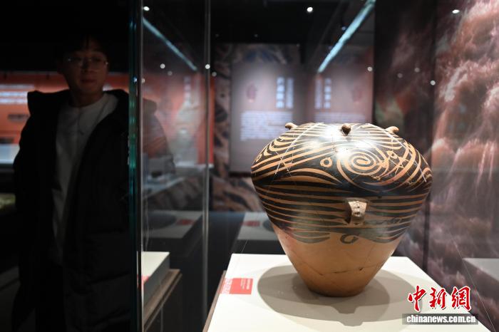 圖為觀眾參觀展出的漩渦紋四鋬雙耳彩陶罐。九美旦增 攝