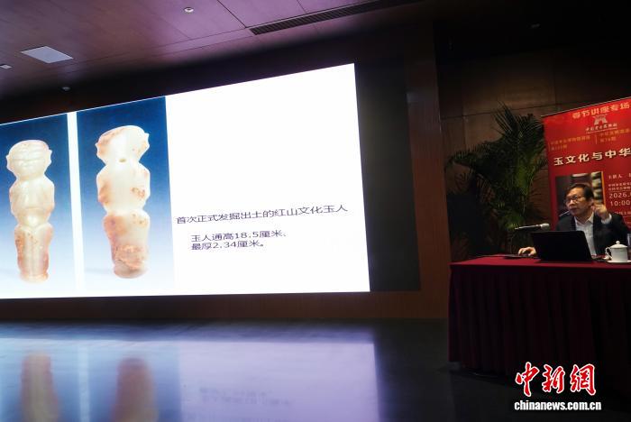 2月22日,中國考古博物館春節(jié)講座專場,劉國祥研究員作“玉文化與中華文明”主題學(xué)術(shù)報告,介紹紅山文化玉人。中新網(wǎng)記者 孫自法 攝 在史前玉器鼎盛期,紅山文化牛河梁遺址出土一批具有典型地域特征和時代風(fēng)格的玉器,使得紅山文化玉器群最終得以科學(xué)確認(rèn),成為中國史前玉器發(fā)展史上第一個高峰期的代表。 江淮地區(qū)凌家灘文化遺址出土玉器1500余件,品種豐富、琢玉技術(shù)先進(jìn)且造型獨特多變,是該遺址的重要特點。 良渚文化玉器則達(dá)到中國史前玉器發(fā)展的頂峰,不僅種類多、數(shù)量大而且制作精湛,玉器上大多刻有神人獸面紋及其各種變體、鳥紋、卷云紋等良渚文化特有圖案,特別流行用玉器做隨葬品。其中,杭州反山墓地出土的一件玉琮,因其體積重量及紋飾均為現(xiàn)存玉琮之最而被稱為“玉琮王”。 此外,石家河文化、齊家文化、陶寺文化、石峁文化等史前文化玉器也都各具特色,并對夏商周三代和后世玉器形制及世俗化、生活化產(chǎn)生深遠(yuǎn)影響。
