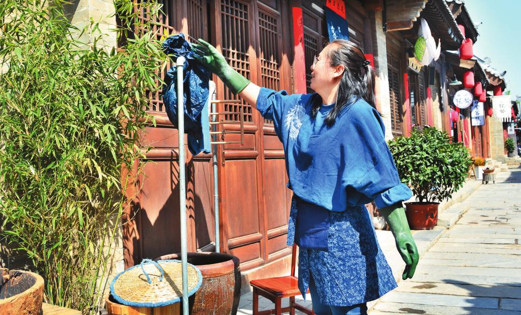 趙慧的藍(lán)染缸是金貴的,但她并不藏私,只要有人愿意學(xué),她總是歡喜接納。來到古城之后,她開展了很多次藍(lán)染體驗(yàn)活動(dòng),大人和孩子們戴上手套,穿好工作服,來到染缸前,把自己親手扎好或畫好的白布放進(jìn)去,起先出來是綠色,然后是淺藍(lán)、深藍(lán),最后得到一塊有白色花紋和圖案的藍(lán)染作品。趙慧愿意把藍(lán)染的樂趣和神奇與更多的人分享,因?yàn)樗茫挥凶尭嗟娜肆私夂椭?,天然染這項(xiàng)古老的技藝才能傳承下去,而不會(huì)丟失在時(shí)光里。