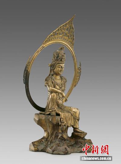中新網(wǎng)金華9月17日電(董易鑫 孫媛媛)高53厘米,整尊觀(guān)音頭戴高冠,冠上飾化佛,身佩瓔珞,左臂撐巖,右臂置膝,左腿下垂,右腿上曲足踏巖石,安坐于山巖之上,身旁石上置一凈瓶,身后一圓輪狀大背光,渾圓精美,邊緣裝飾火焰紋,仿佛巖前有潺潺流水,觀(guān)音目觀(guān)水中月影——這是68年前出土于浙江金華萬(wàn)佛塔地宮的五代鎏金銅觀(guān)音造像,也叫作“水月觀(guān)音”,是國(guó)家一級(jí)文物,現(xiàn)藏于中國(guó)國(guó)家博物館。