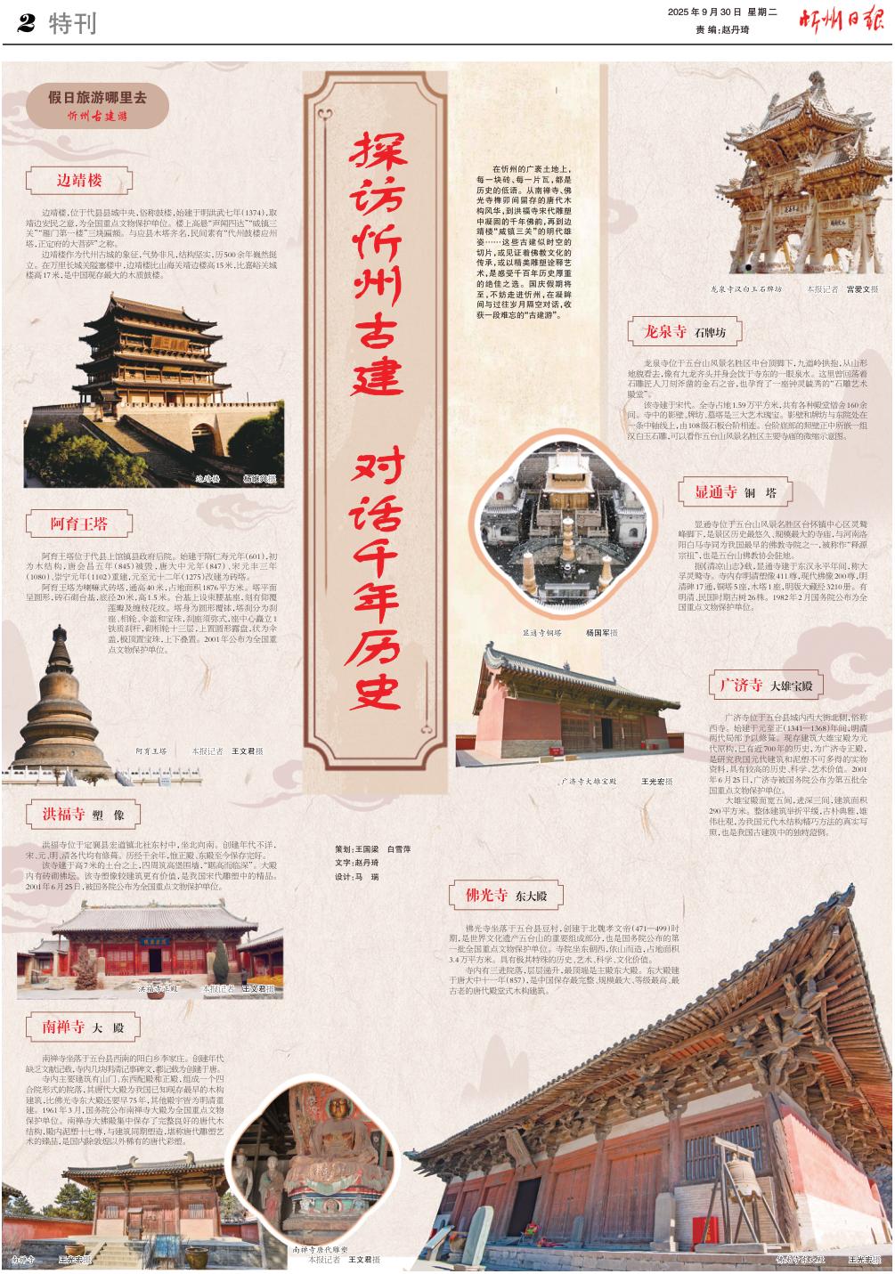 在忻州的廣袤土地上,每一塊磚、每一片瓦,都是歷史的低語。從南禪寺、佛光寺榫卯間留存的唐代木構風華,到洪福寺宋代雕塑中凝固的千年佛韻,再到邊靖樓“威鎮(zhèn)三關”的明代雄姿……這些古建似時空的切片,或見證著佛教文化的傳承,或以精美雕塑詮釋藝術,是感受千百年歷史厚重的絕佳之選。國慶假期將至,不妨走進忻州,在凝眸間與過往歲月隔空對話,收獲一段難忘的“古建游”。