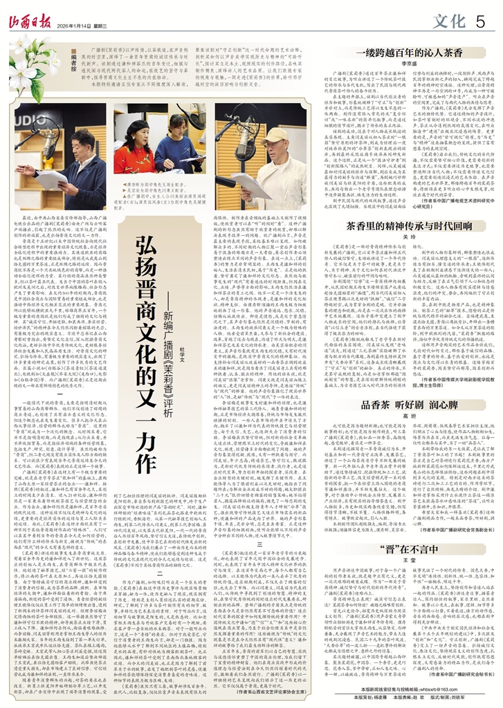 廣播劇《茉莉香》以聲傳情,以茶載道,在聲音構(gòu)筑的時(shí)空里,演繹了一曲百年晉商的誠信傳承與時(shí)代新聲。該劇通過謙和祥茶莊的百年變遷,細(xì)膩勾連民國與現(xiàn)代兩代茶人的命運(yùn),在技藝的堅(jiān)守與革新中,探尋晉商文化生生不息的內(nèi)在脈動(dòng)。