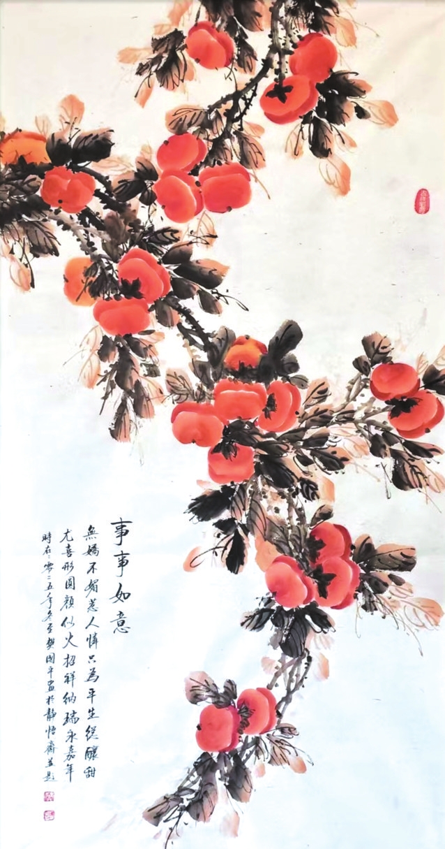 在樊國平眾多題材探索中,《事事如意》系列柿子圖可謂其藝術(shù)精神與人生哲思的縮影。這些作品超越了尋?;B畫的怡情悅性,成為她寄托情懷、叩問生命的重要載體。畫中那一串串、一簇簇丹柿,色澤溫潤,形態(tài)豐盈,承載著諧音“事事如意”的吉祥寓意,滿足了社會對美滿生活的樸素祈愿。她以此通俗意象為入口,引領(lǐng)觀者步入一個融匯儒、道、佛哲學(xué)理念的深邃境界,實踐著中國藝術(shù)“技進(jìn)乎道”“以畫載道”的至高追求。