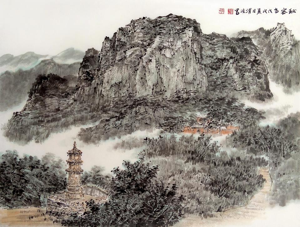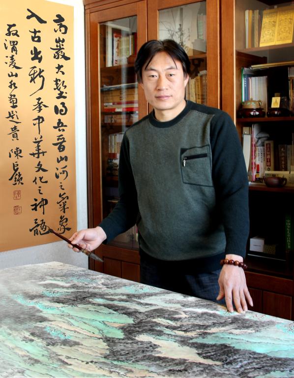 認(rèn)識(shí)殷渭凌,是先認(rèn)識(shí)他的畫,前幾年在一次省里畫展上看到了一幅山水畫,淳樸、厚重,樸實(shí)的親切、厚重的實(shí)在,完全沒(méi)有近幾年流行的風(fēng)氣,也沒(méi)有長(zhǎng)期臨摹傳統(tǒng)繪畫形成的習(xí)氣。正如一個(gè)從鄉(xiāng)村走出來(lái)的小伙,健康、有朝氣、單純、樸實(shí)、憨厚、怯生生的站在那里,給我留下了很深的印象。因?yàn)樾弥莸貐^(qū)畫山水的人不多,很快就認(rèn)識(shí)了渭凌。果然人如其畫,淳樸、厚道、話不多、為人真誠(chéng),是個(gè)畫畫肯下功夫的小伙子。后來(lái)省美協(xié)山水畫藝委會(huì)的活動(dòng)都有他的身影,畫越畫越多,畫的也越來(lái)越好,但是畫面中那種親切、樸實(shí)、厚重、蒼茫的特點(diǎn)卻一點(diǎn)兒也沒(méi)有丟失。濃濃的泥土氣息生發(fā)于筆墨中,散發(fā)在畫面里,在展廳里感染著每一個(gè)觀眾。晉西北風(fēng)情在他的營(yíng)造下得到了充分的體現(xiàn)。