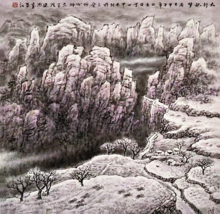 太行秋夢 縱觀中國美術(shù)之路,每一段進(jìn)程、每一次突破性進(jìn)展,都是藝術(shù)家們創(chuàng)造性轉(zhuǎn)化和創(chuàng)新性發(fā)展的成果。歷經(jīng)數(shù)載積淀,周建國的作品在造型和視覺審美上皆取得了更為和諧的可持續(xù)性,畫面境界愈加率真深邃,壯闊雄渾的筆墨結(jié)構(gòu)也更富感染力,彰顯了其對筆墨“以書入畫”的探索。中國美術(shù)家協(xié)會(huì)理事、中國國家畫院副院長、國家一級美術(shù)師趙衛(wèi)評價(jià):“觀周建國先生的作品,或張揚(yáng)激厲,含蓄平和;或機(jī)智靈巧,質(zhì)樸敦厚;皆非流于優(yōu)美的空泛。筆意間、層次間透出凝重的樸厚之氣,拙澀之力,完全把自己融進(jìn)了大自然,有‘坐忘’‘心齋’,游心于物的感受,讓人理解什么是‘天人合一’。其筆墨律動(dòng)意味,有詩般的跌宕意境,空靈而不閉塞,章法構(gòu)圖疏宕而不空泛,他將有限的畫面,在時(shí)間過程的暗示下,賦予廣闊的未來想象?!?/p>