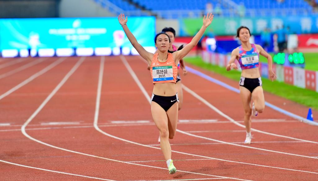 浙江隊(duì)選手陳妤頡(前)在第一屆全國青少年田徑運(yùn)動(dòng)會女子100米決賽沖線后慶祝。新華社記者 吳青昊 攝