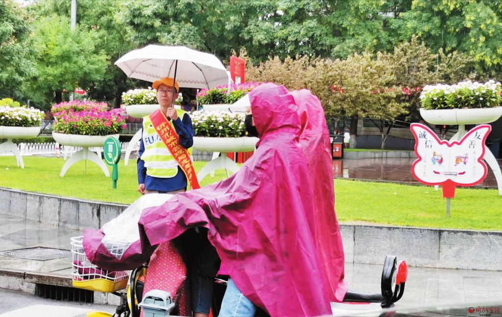 8月31日7點40分,我市城市管理局志愿者早早來到執(zhí)勤崗位,在風(fēng)雨中配合交警在長征街與七一路口維持交通秩序,對橫穿馬路、亂闖紅燈等不文明交通行為進(jìn)行勸導(dǎo),引導(dǎo)市民遵守交通法規(guī),提高安全意識,用實際行動為創(chuàng)建文明城市做貢獻(xiàn)。曹建華 攝