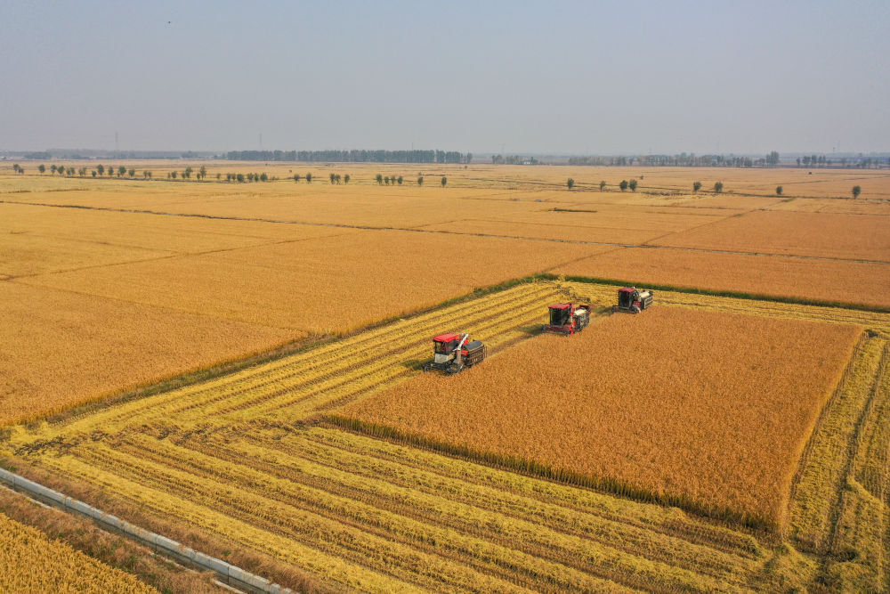 在吉林省公主嶺市,吉林省米兜種植農(nóng)民專業(yè)合作社進(jìn)行機(jī)械化收割水稻作業(yè)展示(2025年10月14日攝,無人機(jī)照片)。新華社記者 張楠 攝