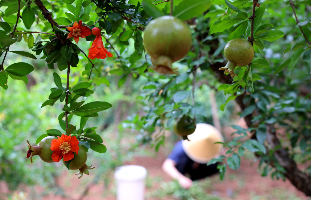 果農(nóng)在山東棗莊嶧城石榴園的石榴樹下勞作(2025年6月18日攝)。新華社發(fā)(孫中喆 攝)