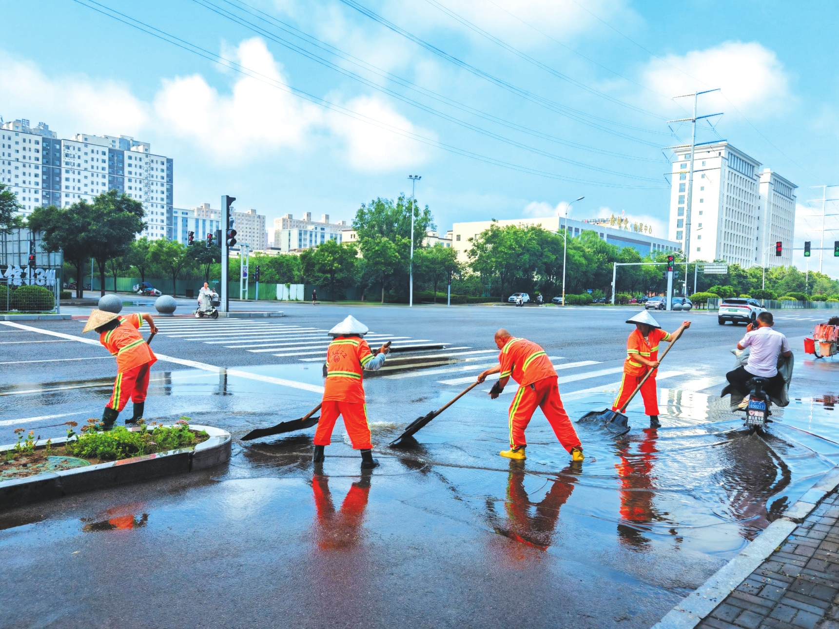 8月5日凌晨,我市降雨天氣造成城區(qū)部分道路路面積水。清晨,環(huán)衛(wèi)工人積極應(yīng)對(duì)雨情,對(duì)轄區(qū)內(nèi)路段開展排水清淤工作,保障市民日常出行。圖為環(huán)衛(wèi)工人在紫檀街路口清理積水。本報(bào)記者王陽(yáng)攝