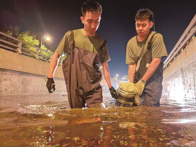 圖為北排洪文興路口,兩位工作人員合力抬起水泵,加緊抽排管網(wǎng)中的積水。本報(bào)通訊員攝