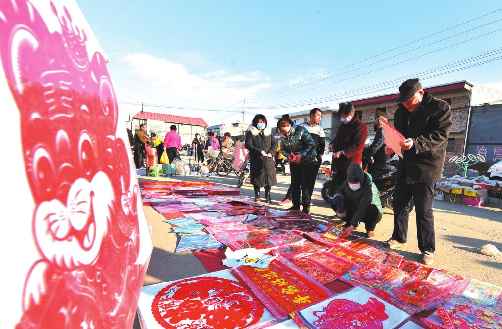 忻府區(qū)東樓鄉(xiāng)南肖村廣場(chǎng)村民挑選春聯(lián)、購(gòu)買(mǎi)年貨